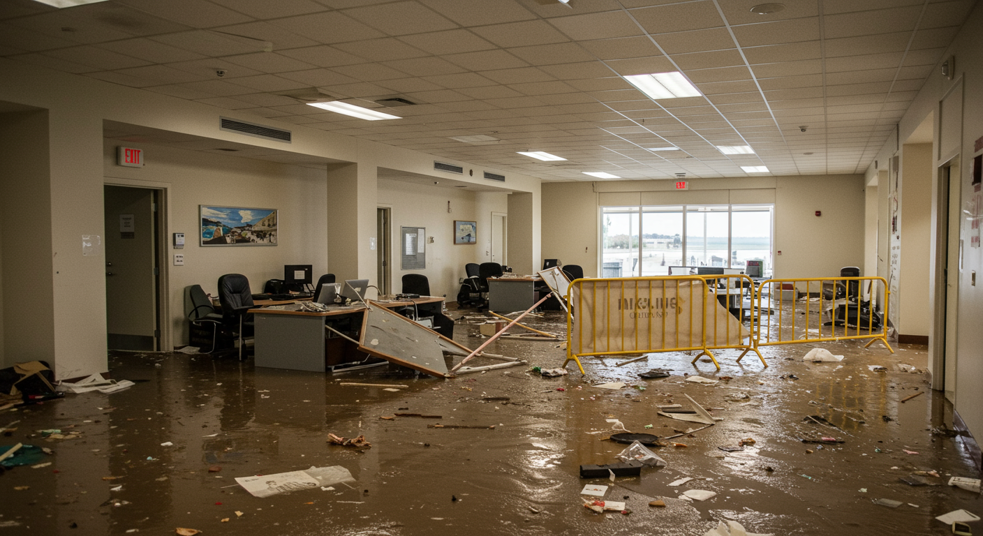 A coastal office building experienced significant flood damage after a tropical storm caused seawater to breach flood defenses. Water infiltration ruined flooring, electrical systems, and office equipment on the ground floor.