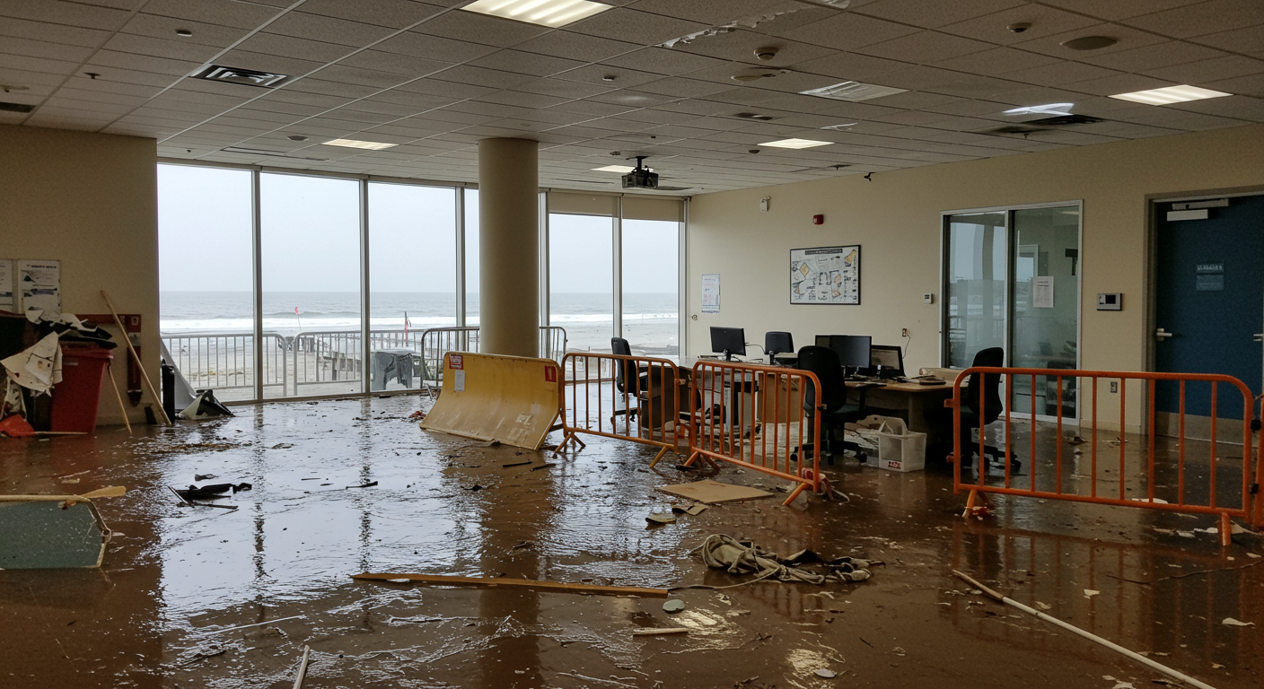 A coastal office building experienced significant flood damage after a tropical storm caused seawater to breach flood defenses. Water infiltration ruined flooring, electrical systems, and office equipment on the ground floor.